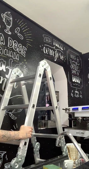 Por isso, me pediram pra fazer essa super parede e deixar o cantinho do café mais leve e com a carinha da empresa deles, pra quem fosse tomar um café se sentir em casa e acolhido.